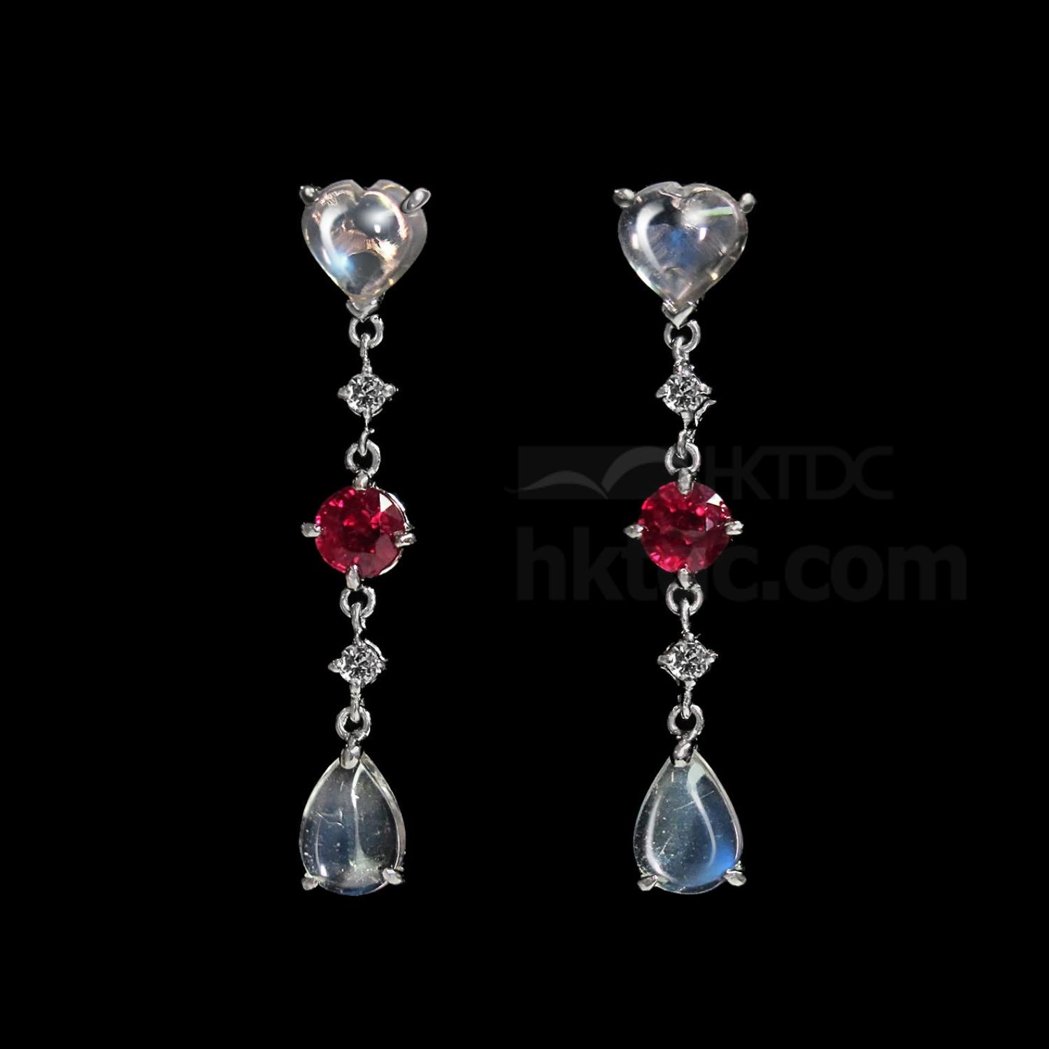 Natural Sri Lankan Moonstones with Natural Rubies and Diamonds in 18KT white gold.
