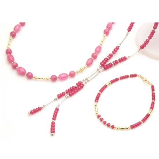 This pretty jewelry set includes two necklaces and a bracelet. The stylish bracelet features well arranged tiny ruby stones. One of the graceful necklaces shares a same design with the gorgeous bracelet. The other necklace is characterized by larger oval red stones, giving a touch of loveliness. Match your casual outfit with this set of jewelry.