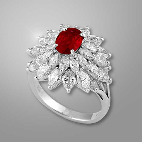 This featured ring comes with a diva design that pleases ladies easily. The ring employs a fierce red ruby at the center to get your attention. The ruby is supported by a wreath of diamonds to showcase a luxurious style.