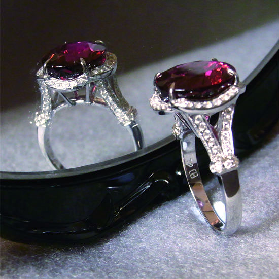 This is a finger ring that comes with an 18-karat white gold structure. The large ruby gemstone adds a touch of luxuriousness to the whole piece. This elegant finger ring is adorned with shimmering diamonds for added uniqueness.
