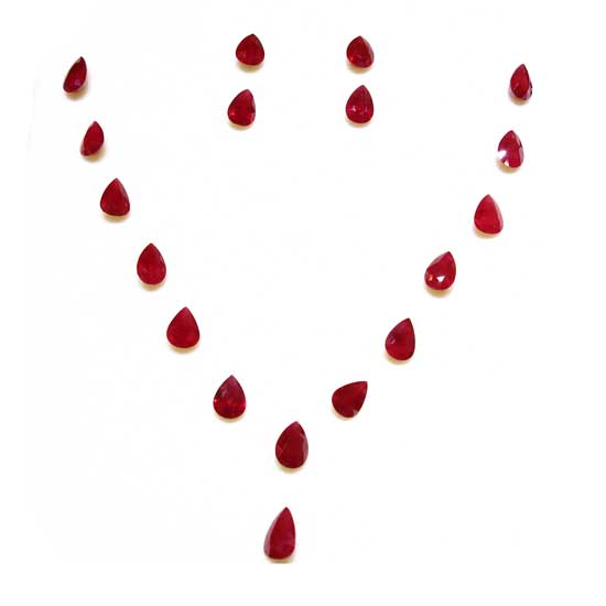 The 18-piece ruby set is originated from Burma for reliable quality. The rubies are well crafted in consistent colors and pear shape. These ruby set is a great choice for manufacturing a necklace with pair of matching earrings.
