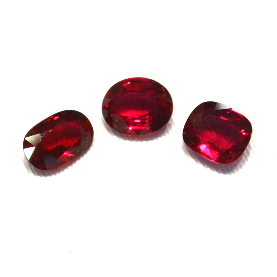 Featured is a collection of three ruby gemstones that are unheated from Mozambique. Each marvelous gemstone boasts bright and dazzling cherry red hue that radiates warmth. The top-quality ruby is respectively cut into an oval, a round and a cushion shape.