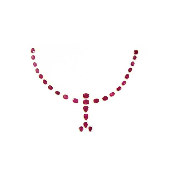 This magnificent ruby set contains 27 pieces of fire red ruby stones, coming with an oval or pear cut. Being created deep inside the core of the Earth, the ruby is distinguished for its fine color and good clarity. The precious ruby bears witness to the passionate and unbridled love between couples.