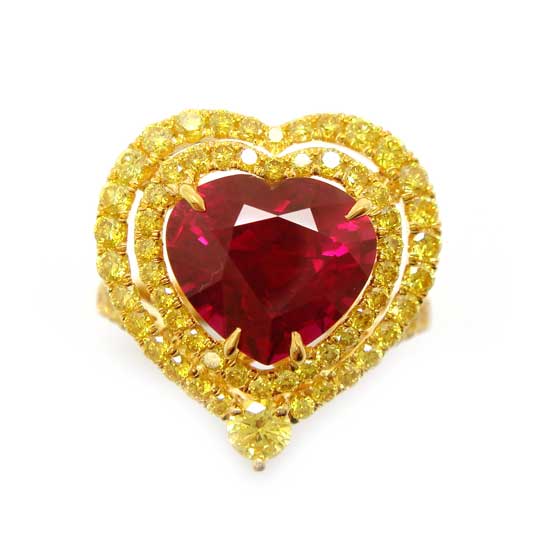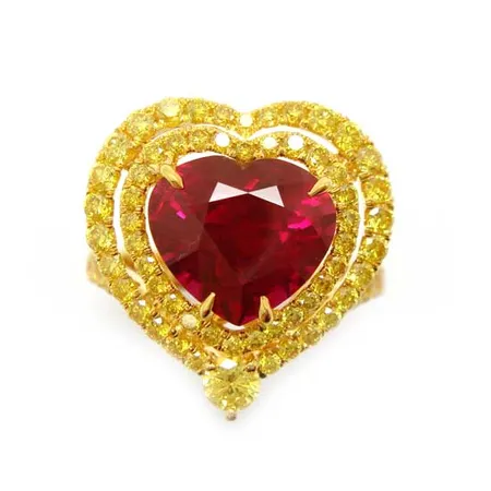 This gorgeous ring spotlights a heart-shaped Burma ruby stone in a pigeon's blood color. The ruby tiny yellow diamonds add a luxurious touch to the jewelry. The fancy ring is a wonderful addition to your jewelry collection.