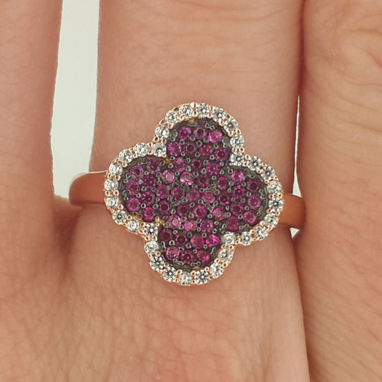 This stunning ring is styled into a four-petal flower. The center is encrusted by loose rubies while white cubic zirconia stones ornament the edges. The gold-plated silver finish further introduces a luxurious air.