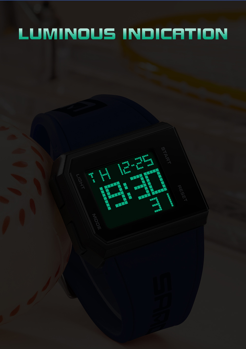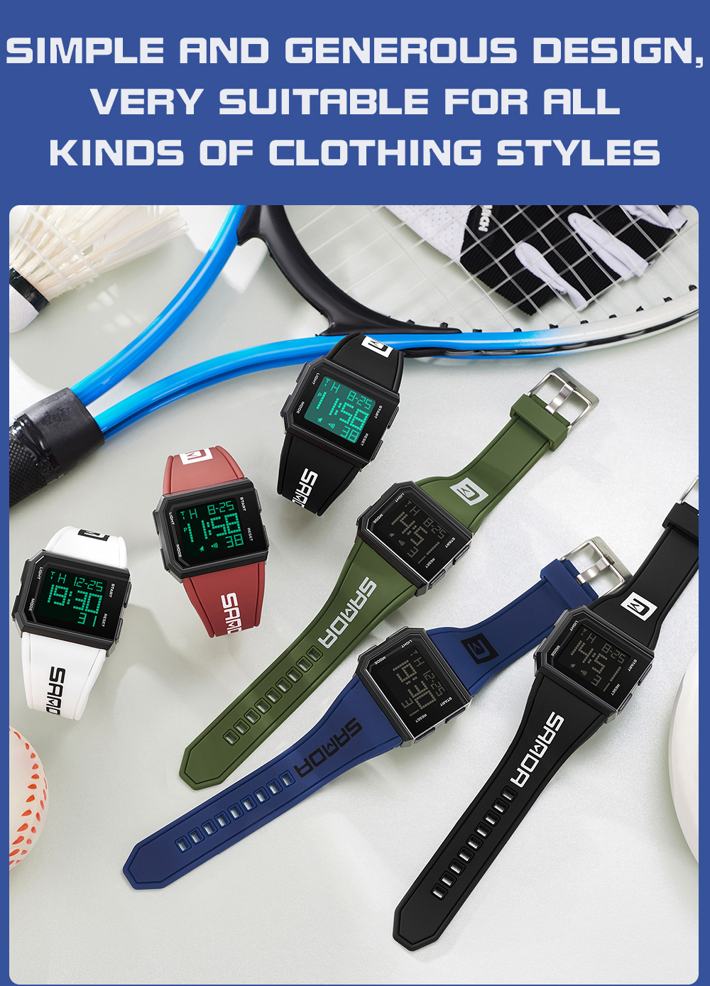 Functionally, it has luminous buttons, week display, mode switching (for time conversion, timer alarm, normal time, etc.), a start/pause key (start/pause in stopwatch status, value increase in time and date setting status), date display, time display, and a reset key (to switch time and date during setting, reset timing, turn on the alarm clock, and report the hour on the hour). It also supports 12/24 dual mode time free switching, stopwatch timing, week calendar viewing, and alarm mode for setting reminder times freely. Available in colors like All Black, Black White, White, Black Green, Black Red, and Black Blue, its simple and generous design makes it very suitable for all kinds of clothing styles.