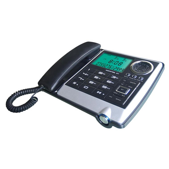 As shown here is a telephone that is designed for storing telephone conversation to a removable SD card. It features long-time digital recording, and supports incoming recording, calling recording, on-site recording, master and family message management. It supports a memory card of up to 4GB with 128 recording hours.