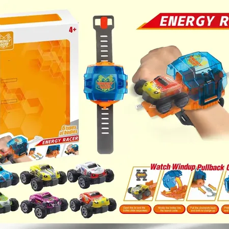 SMART WATCH INERTIAL ENERGY CAR 1- Driving distance: 30M,2- Driving Speed:8-10KM/H,3- Watch size: 26x8 x 6.3cm,4- Main parts : watch x 1,clockwork x 1,inertial energy car x 1,pvc car shell x 3,5-Function:Clockwork pullback forth continuously to store kinetic energy to launch the car
