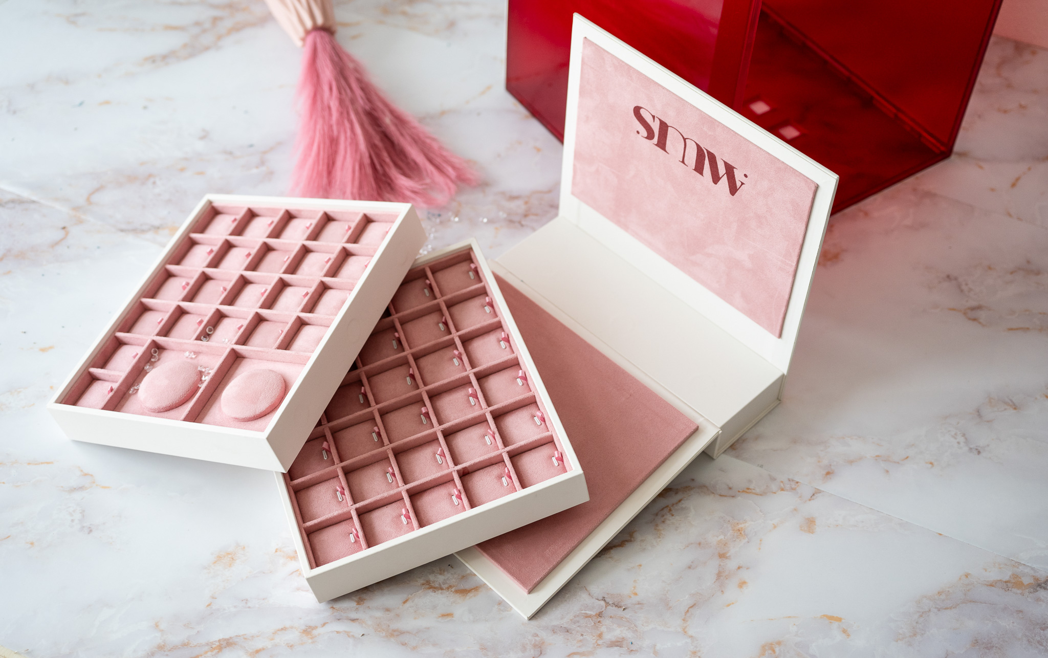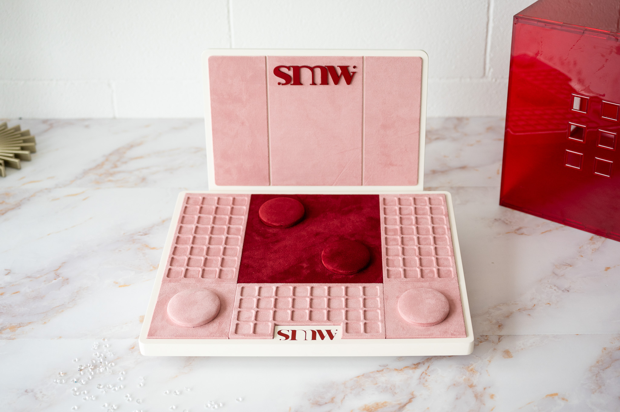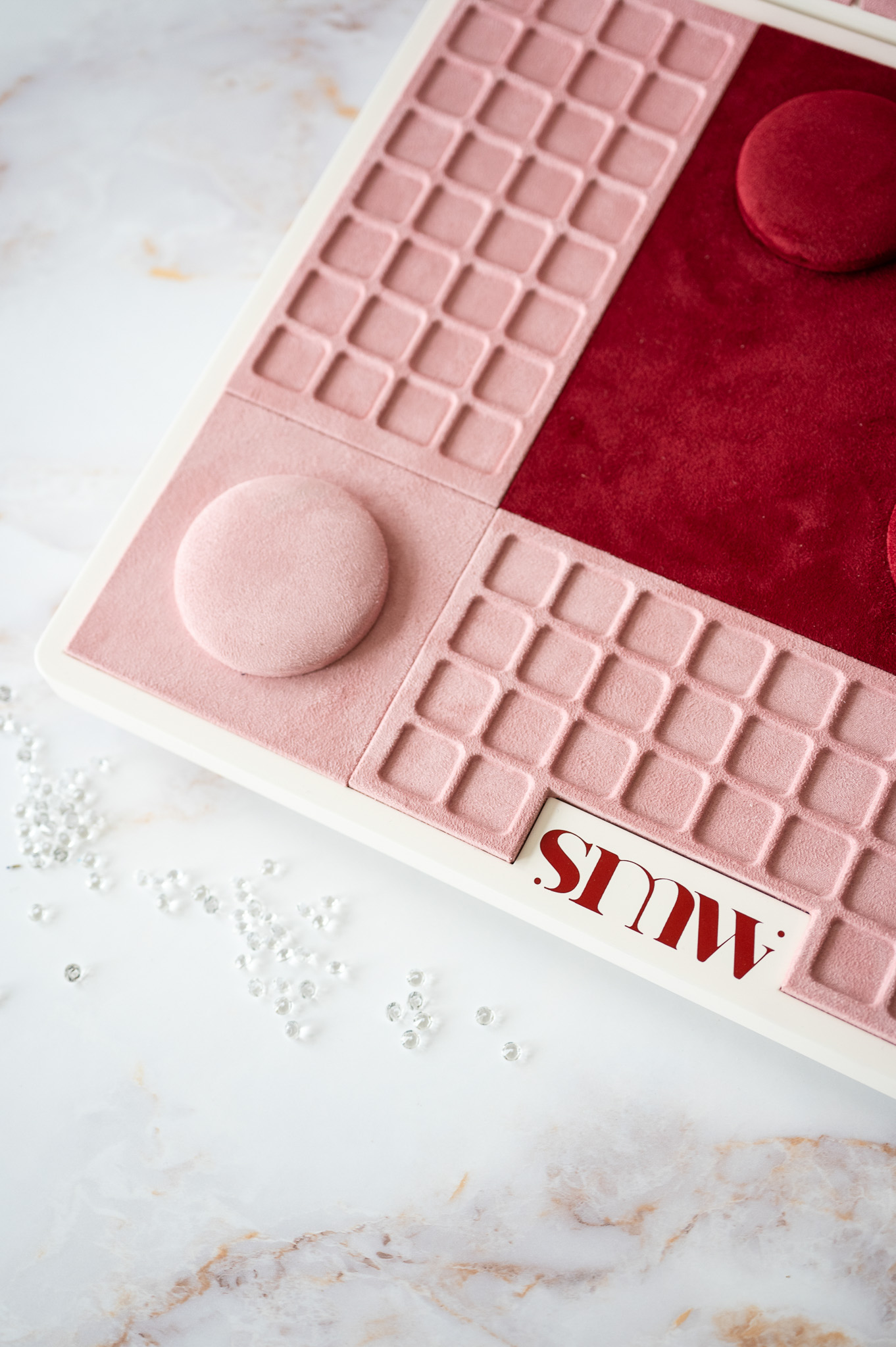 For the Portuguese client Flamingo, we created a jewelry window display and matching tray in bordeaux and pink microfiber, with rounded edges, for a modern and elegant style.