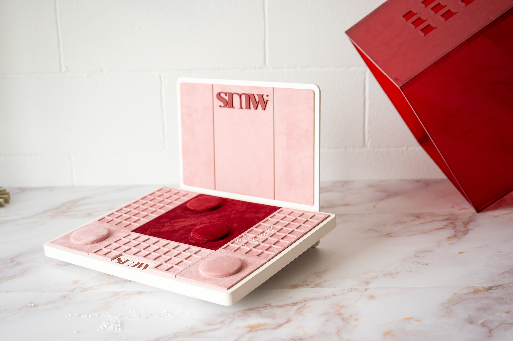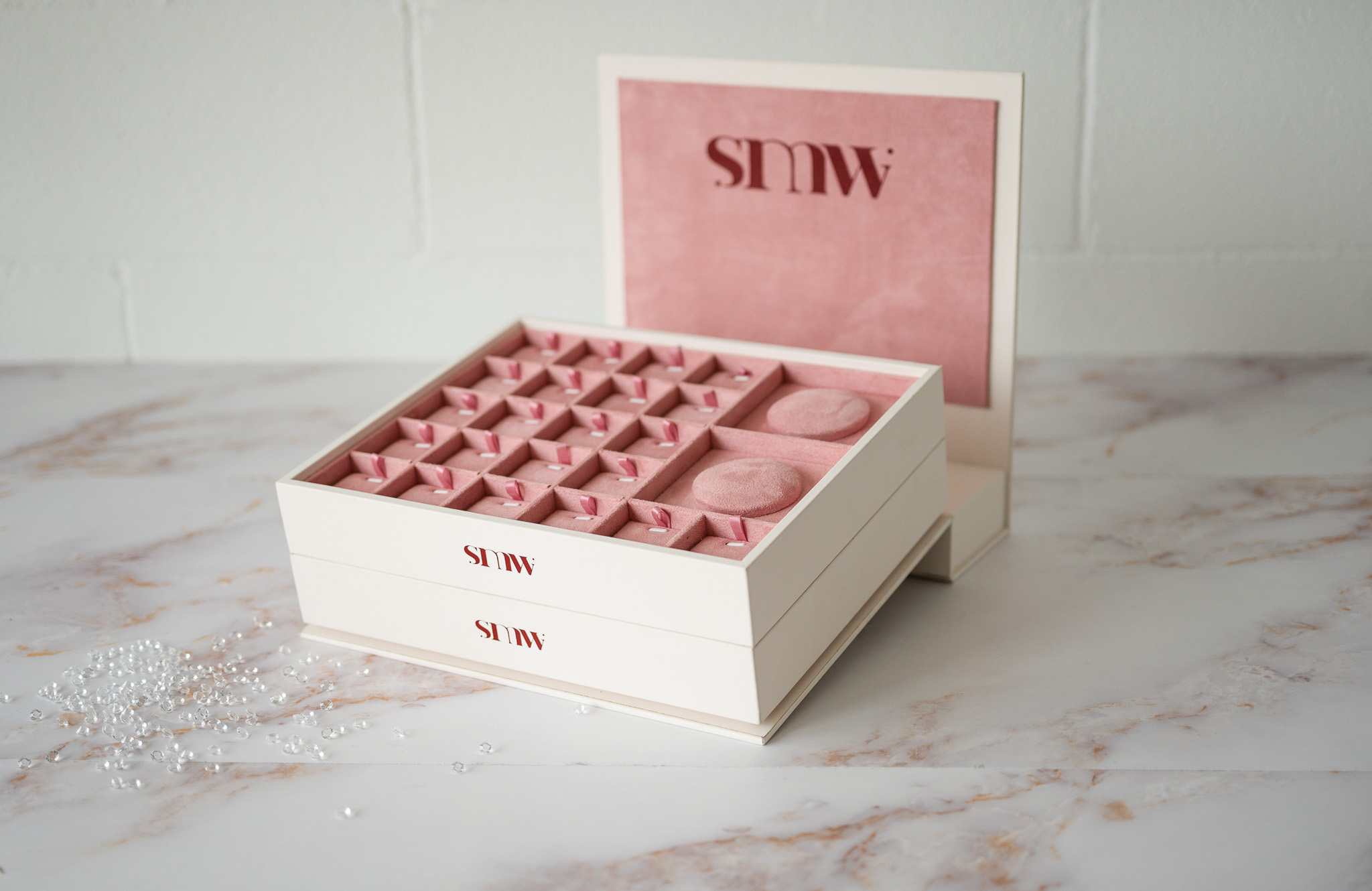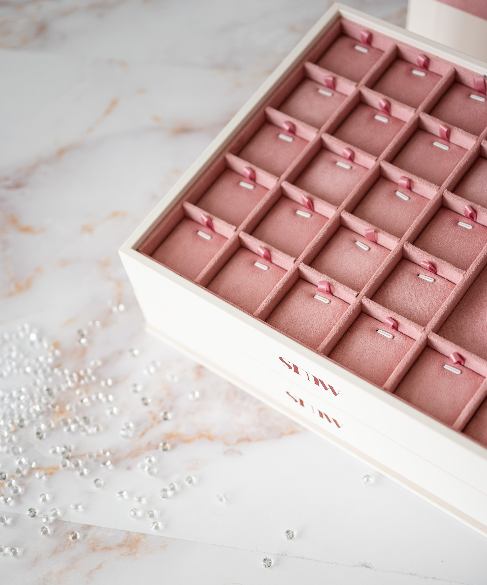 For the Portuguese client Flamingo, we created a jewelry window display and matching tray in bordeaux and pink microfiber, with rounded edges, for a modern and elegant style.