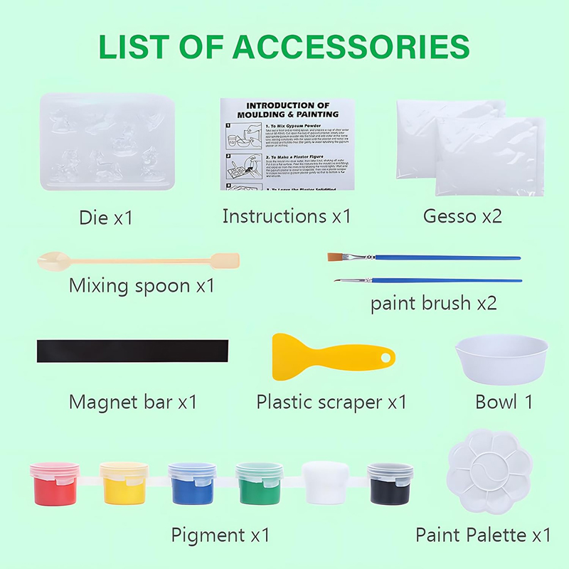 【FUN DIY PAINTING】: Enjoy the fun of painting! The painting craft kit includes 2 packs of plaster powder, modeling tools, 6 paint pots, 1 palette, 1 mixing bowl, 2 brushes, matching tools, 1 magnet set and an instruction booklet. Rich painting accessories to keep them away from electronic devices while painting. Suitable for parent-child interaction and classroom activities to improve children's cooperation and social skills, perfect for children's activities and parent-child interaction. 【SAFETY AND QUALITY】:Water-based, non-toxic painting with high quality plaster figurines makes it safe and clean for babies and children. Kids can mix and create more colors according to their favorite colors, paint any color you want on the plaster statue, mobilize your child's imagination to show your talent in the painting game. This children's arts and crafts set is sure to keep your boys and girls entertained for hours. 【FUN AND EDUCATIONAL TOYS】:Ready to make your own figurines? This plaster painting set will meet all your child's needs, providing plenty of painting practice and creative fun, improving creativity, concentration and imagination, and developing hand-eye coordination and color perception. The figurines include a lion, a panda, a giraffe, a penguin, an elephant, a flamingo and a big tree, so come and let your kids have fun learning to combine colors! 【GREAT FUN FOR YOUR CHILD】: Enjoy the sense of accomplishment and artistic beauty by creating works that can be attached to the refrigerator with magnetic stickers or double taped to the bed, living room, bedroom, etc. The plaster toy painting kit includes four series, outer space, desserts, dinosaurs and animals. Children can simulate four different scenes, choose their favorite patterns, mix their favorite colors and create their own fairy tale world. 【The best handmade painting gift】:Suitable for children's parties, art activities, classroom craft supplies for painting gifts, children naturally like to draw this is a very popular gift for them, a good choice for boys and girls aged 6-12 who like to show off their craft and painting talents. There is also a beautiful colorful box packaging is the perfect gift for children's day, Easter, Christmas, Halloween, birthday or any other holiday, the best painting toy set.