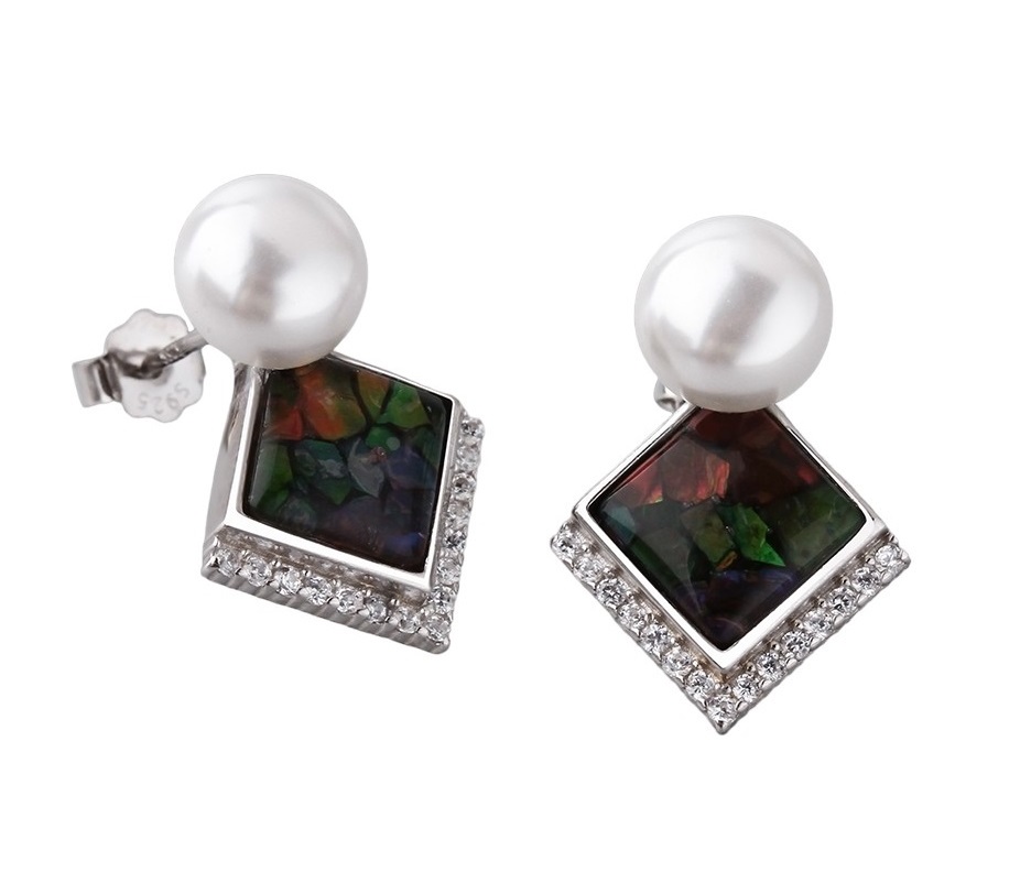 STERLING SILVER EARRINGS WITH 7.5-8MM BUTTON FRESHWATER PEARL AND CZ, AND BLACK AGATE, RHODIUM PLATED