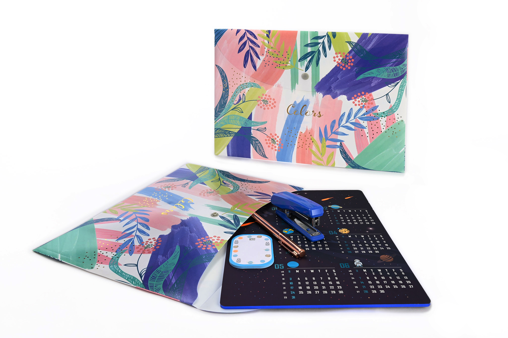 Waterproof and dustproof, these plastic portfolios are ideal for your essential documents. Made of durable recycled materials, printed in full colour and fine gilding. Four designs to make storing important papers a pleasure. Larger than A4 and with secure button closure. Bring style to your files.