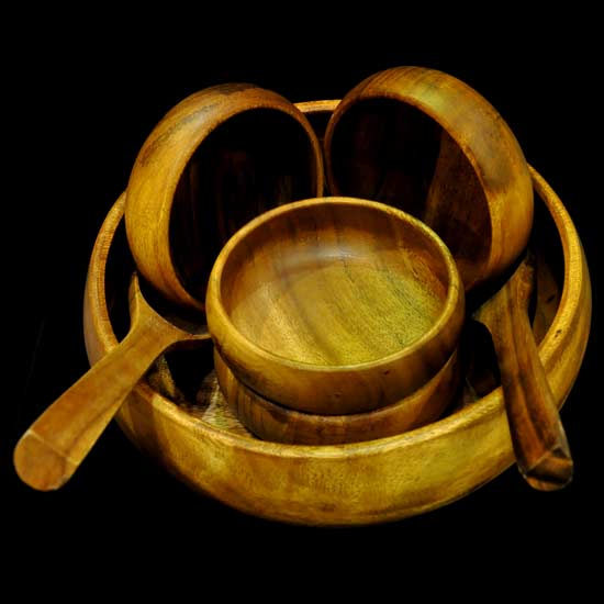 This sophisticated salad bowl set contains a calabash salad bowl, 4 serving bowls, and two salad-mixing spoons. The nature-inspired wooden construction lends an effortlessly harmonious touch to your kitchen. All the items in the set come in a beautiful polished finish.