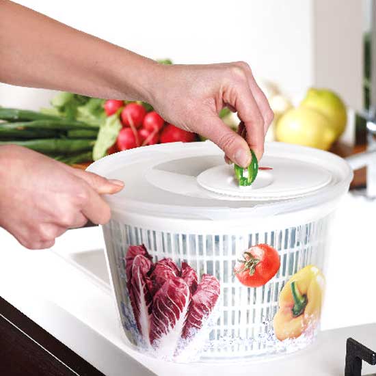 This salad spinner is a kitchen tool used to wash and remove excess water from salad greens. It has an internal collapsible basket that is removable for easy cleaning. With a non-slip knob, this salad spinner brings fun and ease to salad preparation.