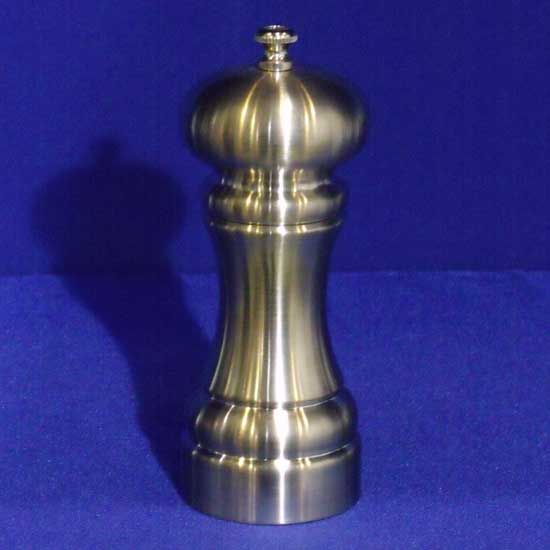 This salt and pepper mill features an exquisite body. It is detailed with hollowed rings for additional style. The electroplated matte finish boasts a pragmatic touch.