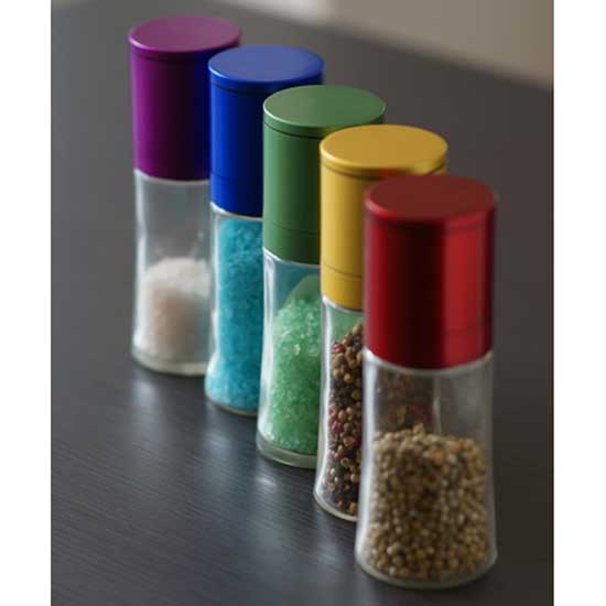 Highlighted are salt and pepper mills which come with durable anti-corrosion ceramic cores. Each features a vividly colored cap for a sightly design. Enjoy convenience during food preparation brought by these delicate mills.