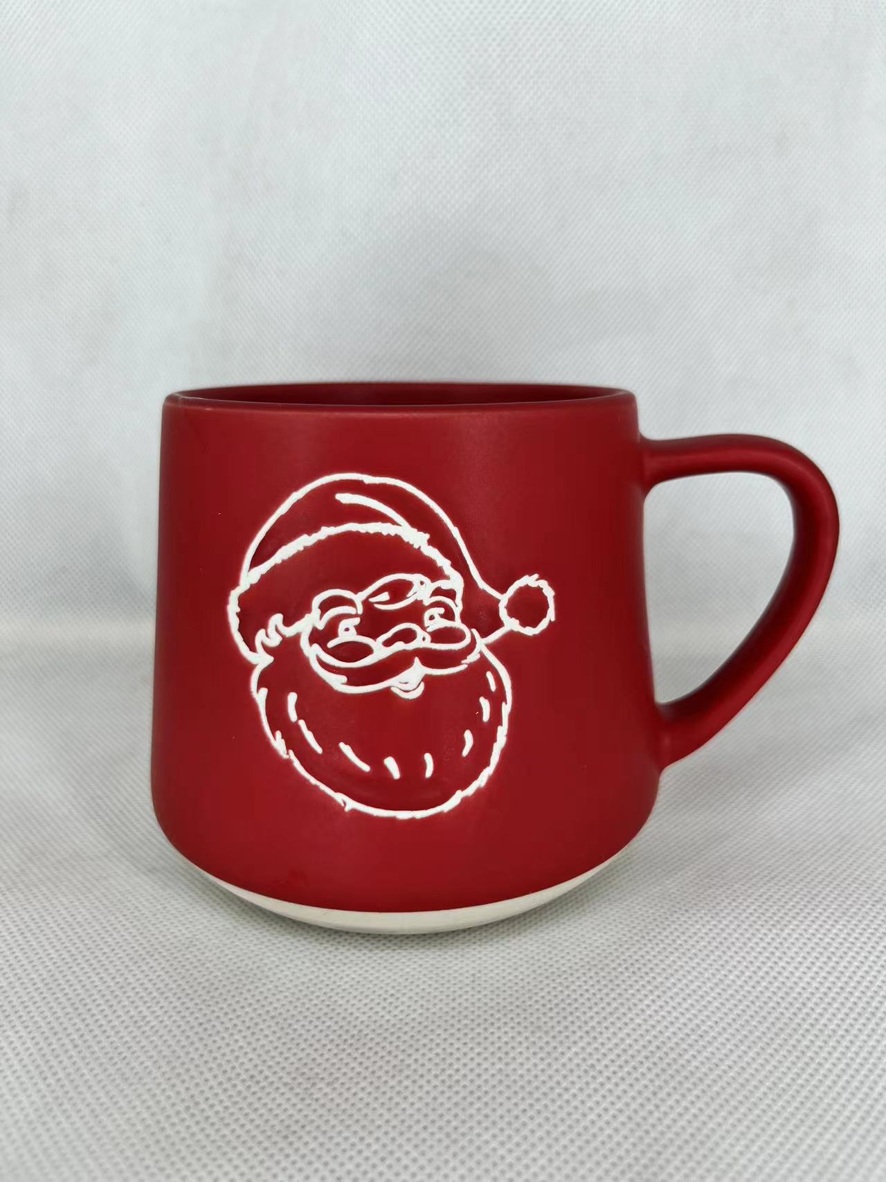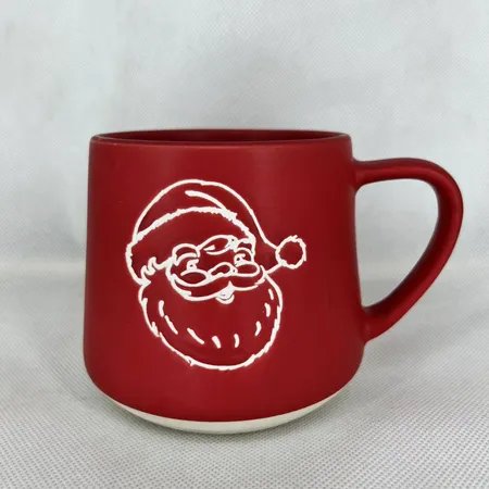 This is a charming ceramic mug. Its body is in a vibrant red color, exuding a warm and festive atmosphere. Adorning the mug is a white - drawn Santa Claus face, complete with his iconic hat and a jolly expression, which is perfect for the Christmas season.