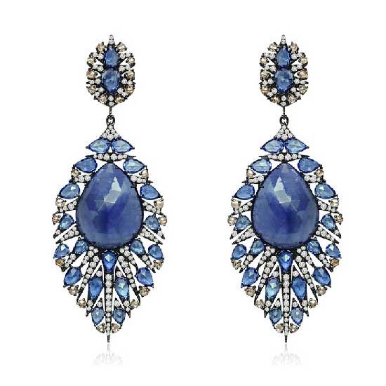 This is a pair of sapphire earrings that is accented with starburst tanzanite gemstones. All the gemstones come in different shapes and natural colors. This pair of earrings will add subtle elegance to your outfit.
