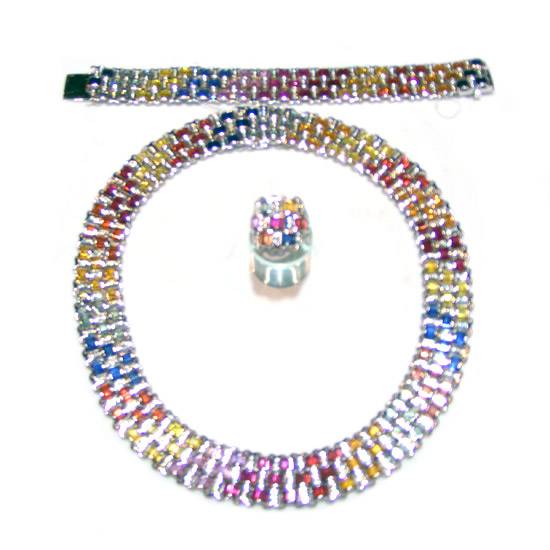 This is a sapphire jewellery set. The sapphire jewellery set comes with a bracelet, a necklace and a ring. Colourful sapphire stones are mounted on the pieces in fancy pattern.
