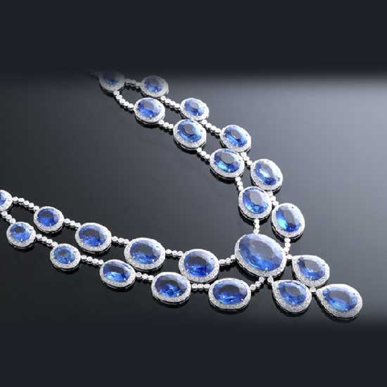 Displayed is a sapphire necklace mounted on platinum. Designed in a collar style, the necklace features two parallel chains accented with round sapphires and a centerpiece consisting of a large round gem with three pear-shaped dangles. This gorgeous sapphire necklace is a great choice to complete an elegant look.