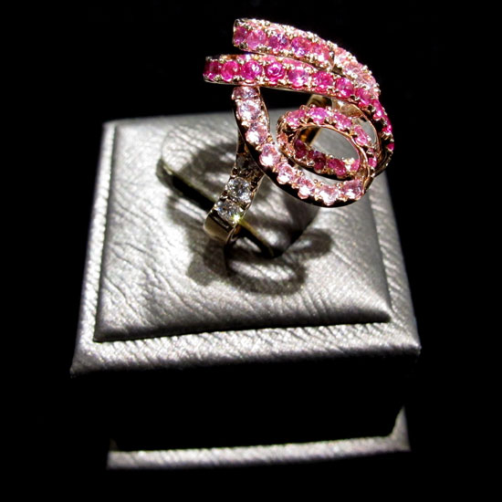 This gorgeous ring is decorated with pink sapphire stones and glistening diamonds. This exquisite ring flaunts a unique connected double-heart pattern to add a decorative touch. The ring is an excellent item to accessorize your outfits.
