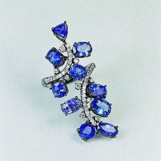 This is a finger ring with an elegant and sparkling design. It features an 18K white gold mounting and is highlighted with 10 sapphire stones. The paved diamond elements make this ring look more dazzling.