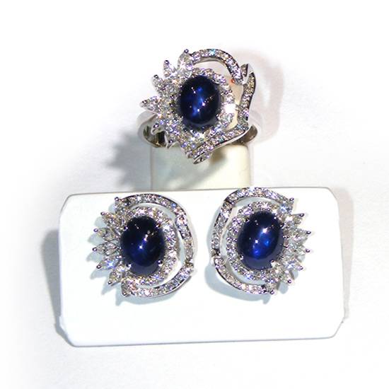 This set of jewellery includes a ring and pair of earrings. The most eye-catching feature is surely the oval-shaped sapphires, surrounded by golds and diamonds. Around the sapphires are two generally circular pieces, covered with faceted diamonds. On one side of the sapphire, the pattern looks more special, because there are seemingly triangular pieces, instead of a smooth rim of the circles.
