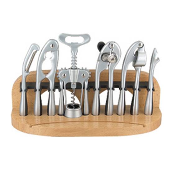 These set of satin nickel plated kitchen tools includes peeler, nut cracker, corkscrew, can opener, garlic press and a cap opener. The are made of full zinc alloy material.