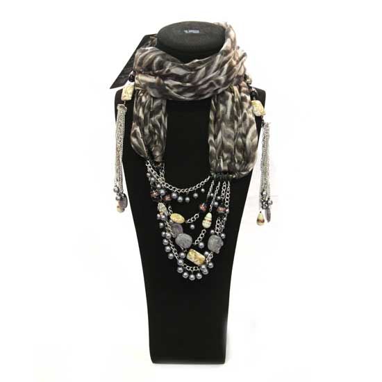 This featured scarf is designed with a fancy chain necklace. The patterns on the scarf echo the patterns of the assorted beads. This innovative accessory spices up your everyday look immediately.