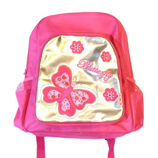 This is a school bag mainly made of high-quality polyester. It features two compartments with zip closures and two side pockets. This bag is printed in pink with beautiful butterfly and flower embellishments, appealing to girls instantly.