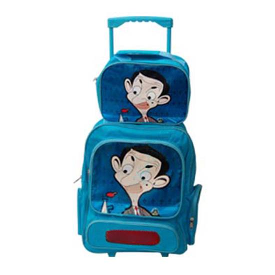 This is a set of school bags for primary school students. Featuring a man in suit, the set includes a main school bag with an adjustable pulling handle and a small handbag. The school bag has several sections for sorting different items such as books, pencil case and water bottle.