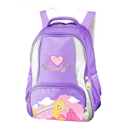 This is a school bag with an attractive and lovely design. It comes in bright pink with colorful cartoon patterns and silver accents. The zip pullers are designed in a cartoon duck shape for enhanced cuteness.