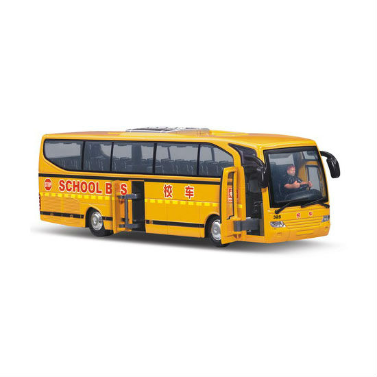 - Bus toy in yellow with the word “School Bus” printed in red.