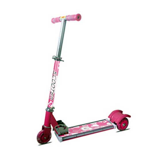 This lovely pink scooter bike is adorned with colorful graphics on the front tube and deck. It is fitted with two sturdy and smooth wheels for a safe and fun ride. The back wheel is designed with a brake system for added safety.