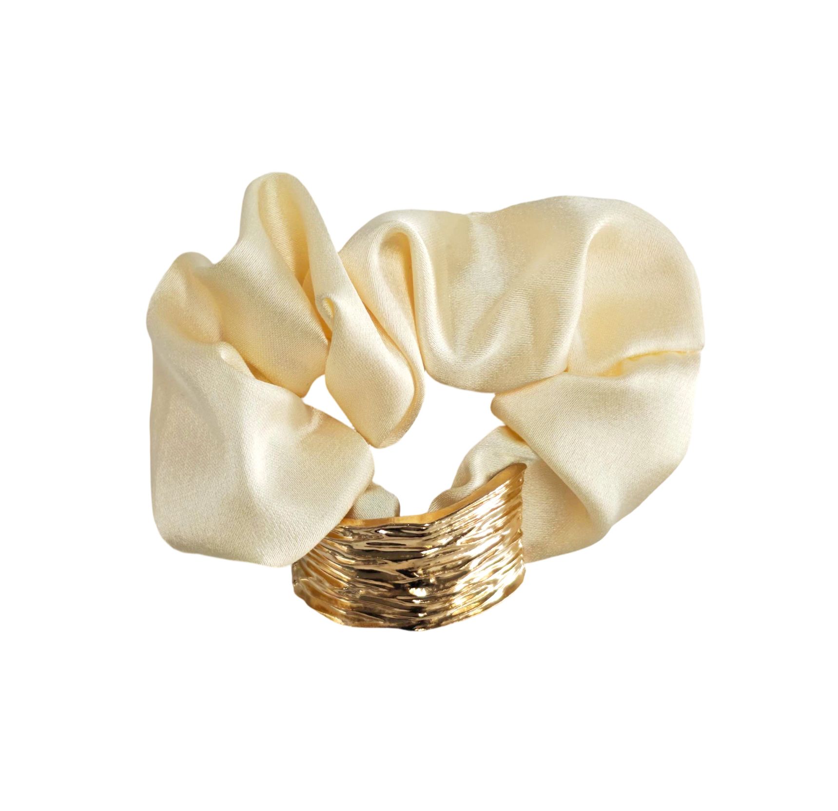 This elegant satin scrunchie features a textured gold cuff, blending soft fabric with luxurious metallic accents.