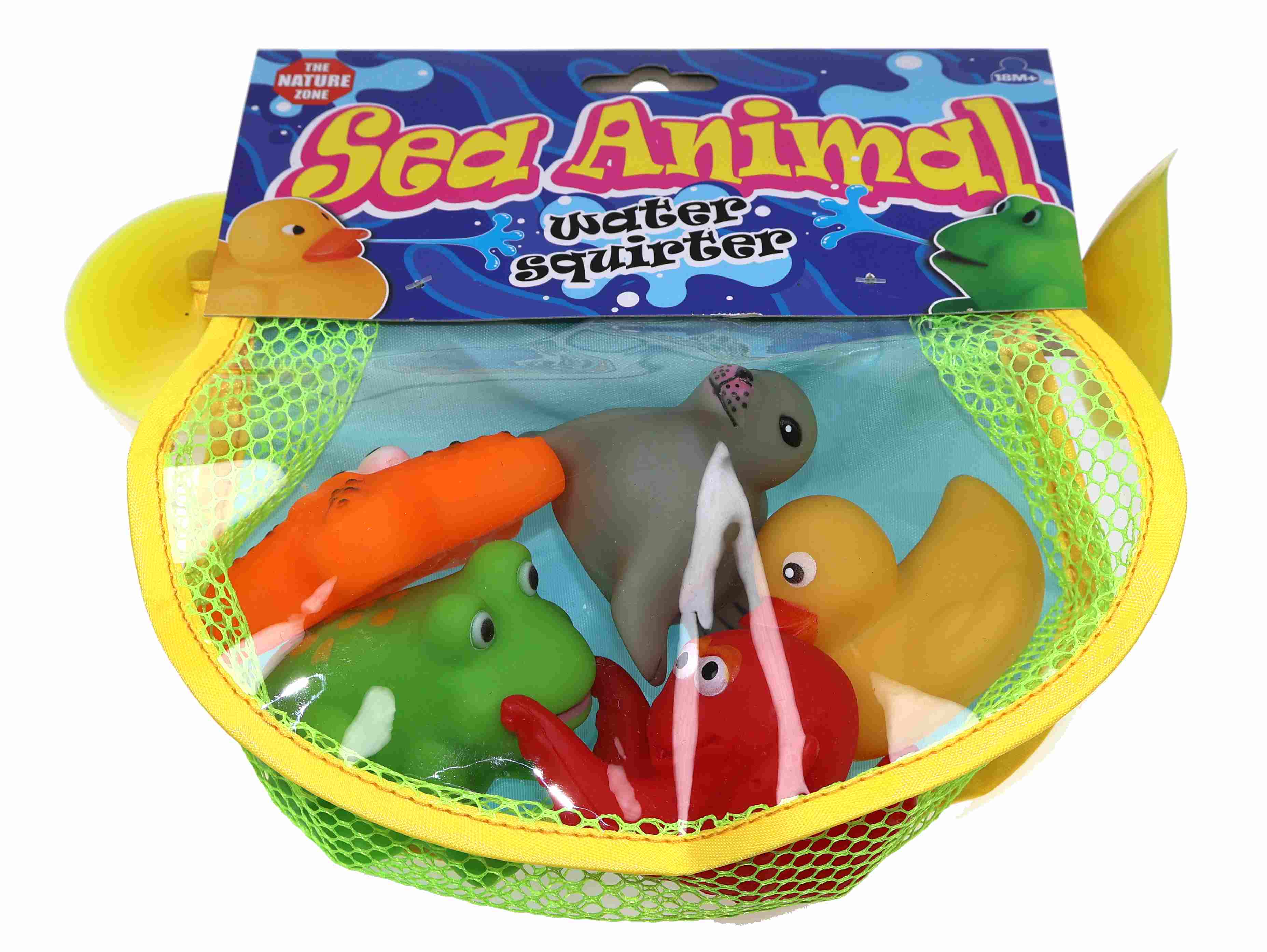 Set of 5 animal water squirters in bag with suction cups. The bag can fix on wall with suction cup and hold the water squirters in the bath room.