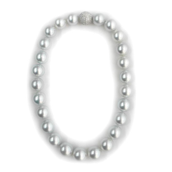 The necklace is strung with round sea pearls of refined quality. Each pearl is plump in shape and reflects an apparent luster. The necklace is a perfect piece to accent and prettify your neckline.