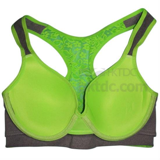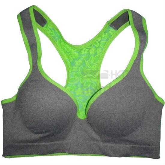 Make a fashion statement while running with this trendy sports bra coming in an eye-catching color. Flaunting a seamless design and super stretch materials, the molded cup bra provides additional support to female breasts during physical exercise. Featuring a grey front and a slightly sheer fluorescence yellow lace back, this sport bra keeps you cool and fresh when doing intense cardio.