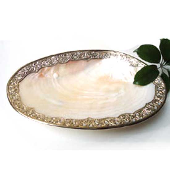 The plate is made of a natural seashell from a big river or the Pacific Ocean. It is finely crafted with a silver rim for added class and style. Grace up your home decor with this seashell plate.