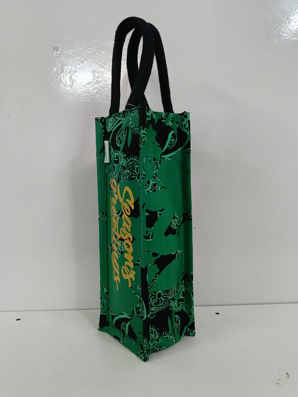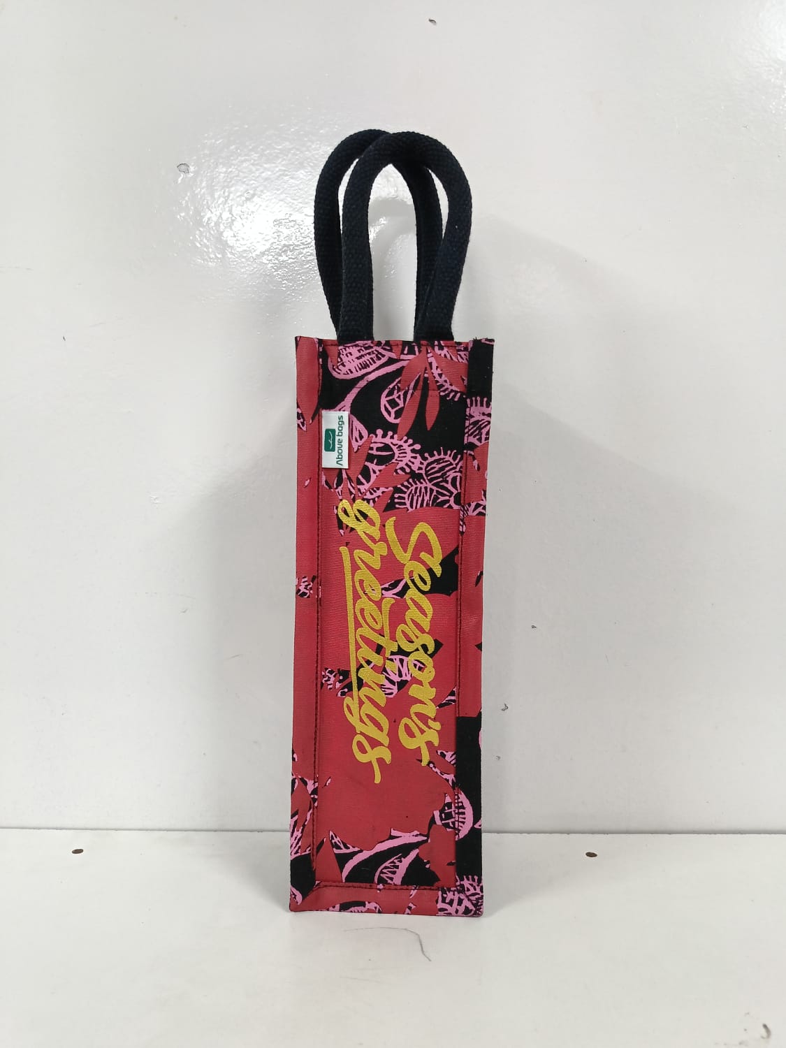 Black Season's Greetings Promotional Canvas Bottle Bag. Size: 10.50x30.50x10.50 cm / Handle: 29 cm Black Cotton Web Handle. Print: 2 colour print all over with one side Metalic Golden colour - Materials Black Laminated 310 GSM Canvas. Accessories Seasons greeting collection,satin lable,hangtag.