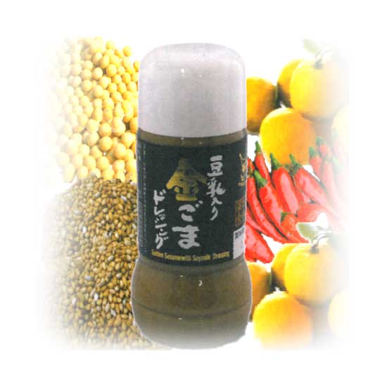 Displayed is a bottle of soy milk and golden sesame seasoning sauce. Following a special recipe, this sauce has a balanced taste of soy milk and sesame, which enhances the flavor of each other for an even richer gustatory experience. This delicious seasoning sauce is ideal to be used as salad dressing and many other dishes.