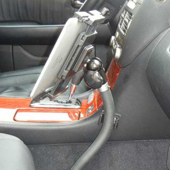 This seat bolt mount features a 20" (50cm) flexible pole curved at the upper part with provided U holding base to secure at front dashboard. It has a mounting bracket fitted at the bottom that attaches to your vehicle's seat rail bolt. The swivel ball in the clamper at the top of pole hooks up the tablet holder, allowing it to tilt and turn for best viewing angle.