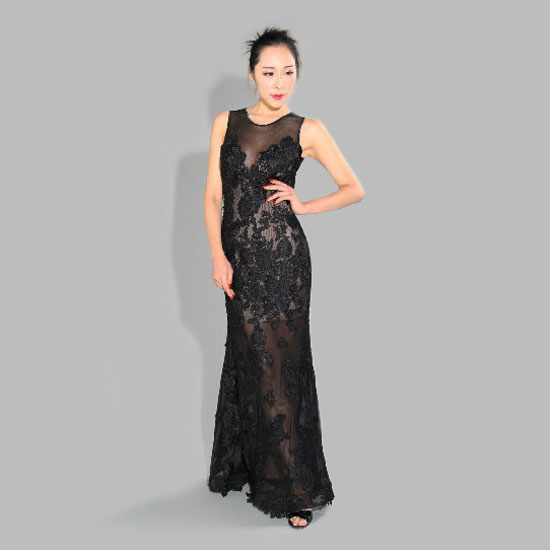 This evening dress is attention-grabbing with its see-through mesh details on the front, sexy yet modest. The evening dress is covered with lace details all over for a feminine look. This elegant piece is the perfect choice for formal occasions.