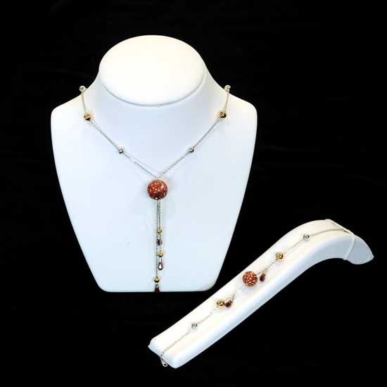 Highlighted is a semi-precious stone jewelry set featuring a necklace and a bracelet. Each boasts a slim chain beaded with gorgeous yellow and white gold balls. The semi-precious stone charms are finely cut for maximum light return. These necklace and bracelet are ideal additions to you jewelry box.