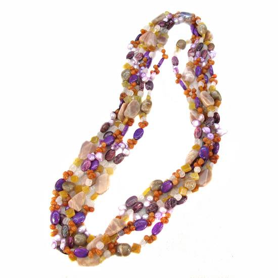 This is a semi-precious stone necklace. The necklace features different shape of beans with different colour. The beans are being linked with extremely durable flag. It is suitable for ladies.