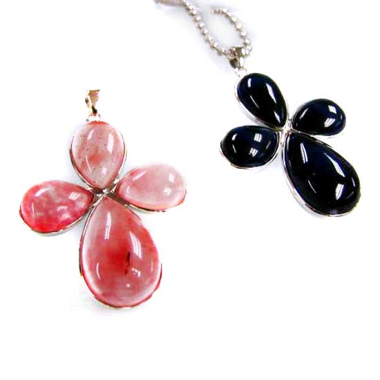 Highlighted is a beautiful pendant made of semi precious stones. The stones are cut into a drop shape and polished to a lustrous surface. The polished stones are set into a delicate metal base to accomplish this adorable pendant.