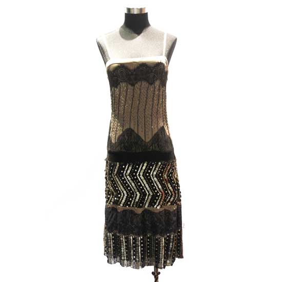 This beautiful cocktail dress features sophisticated sequin patterns in metallic colors. The simplistic strap balances the heavy adornments. This fancy dress allows the wearer to shine in any occasion.