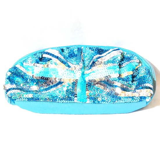 The cosmetic bag features a semi-circular bag body with a zipper closure. The bag is decorated with blue and white sequins to create an England flag design. This cosmetic bag makes a stylish way for packaging your beauty essentials.
