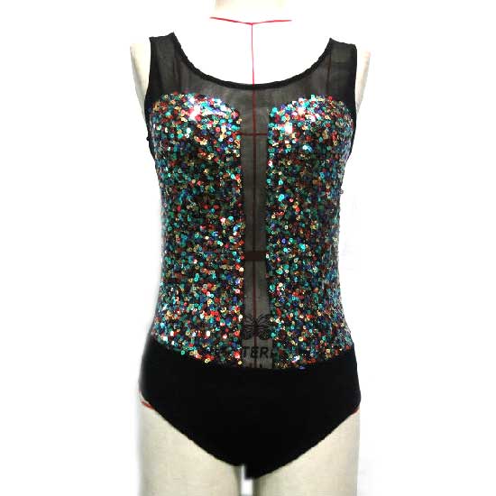This ladies’ top features a leotard style for added uniqueness. It is ornamented with shiny sequins in assorted colors on the left front and right front. The translucent black design at the top brings a seductive touch to the look.